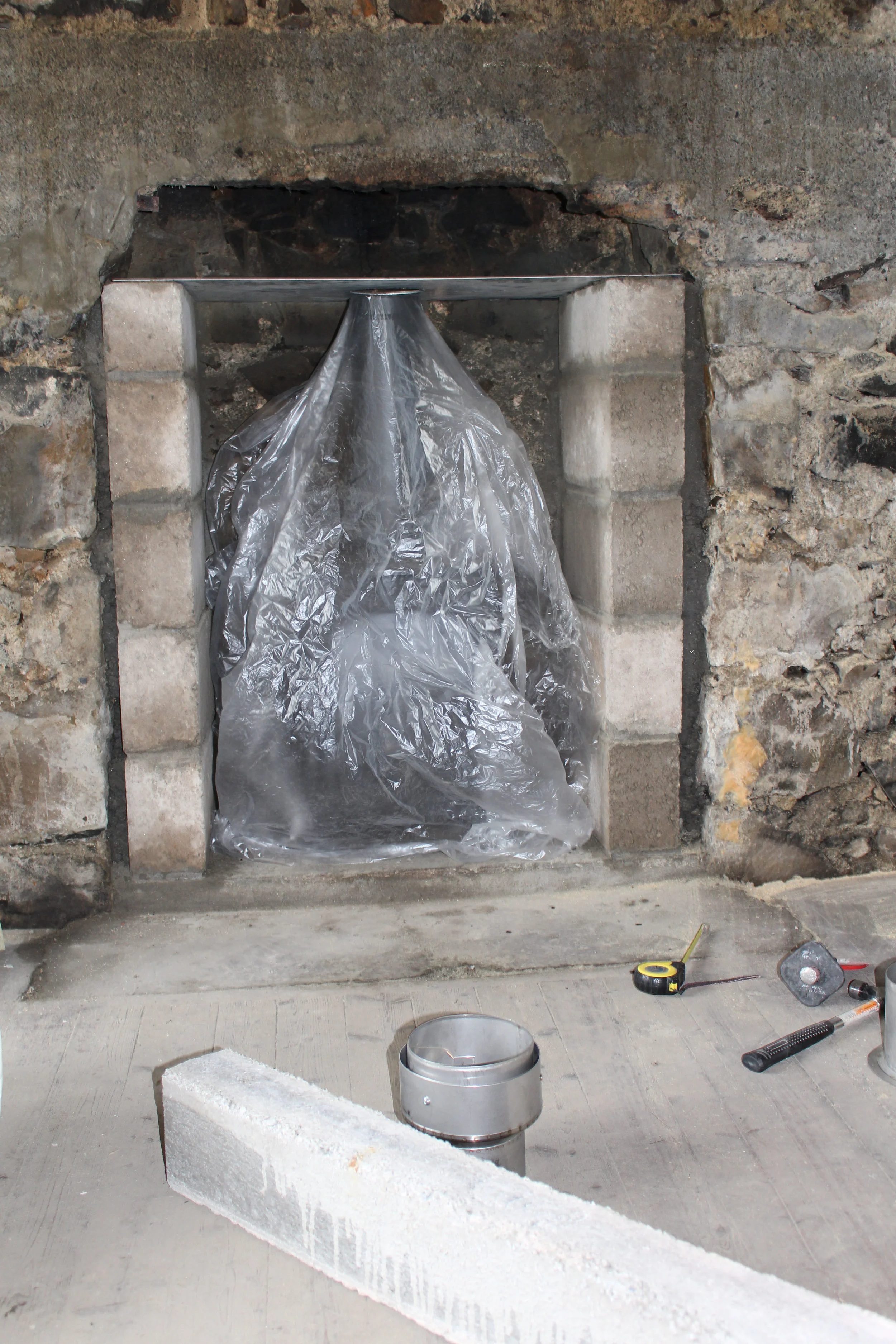 In the foreground you can see the concrete lintel and the liner adaptor. The adaptor takes the stove flue pipe and connects it to the flexible flue liner - it sits above the register plate, with the bottom flange poking through the hole.